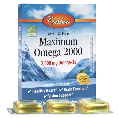 Maximum Omega 2000 is now available in convenient, on-the-go packs®great for a purse, work bag, gym bag, or traveling. Each box includes 3®10 soft gel packs. Maximum Omega 2000 provides 2,000 mg of omega-3s per serving, including 1,250 mg of EPA and 500 mg of DHA, which support heart, brain, vision, joint, and immune health.